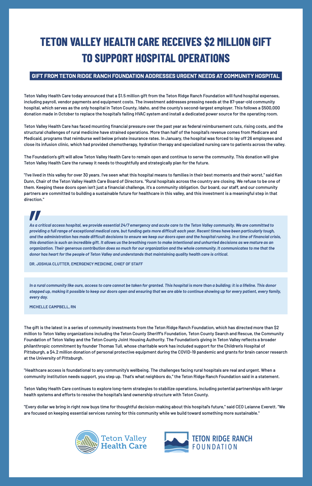 Teton Valley Health Care Receives $2 Million Gift to Support Hospital Operations